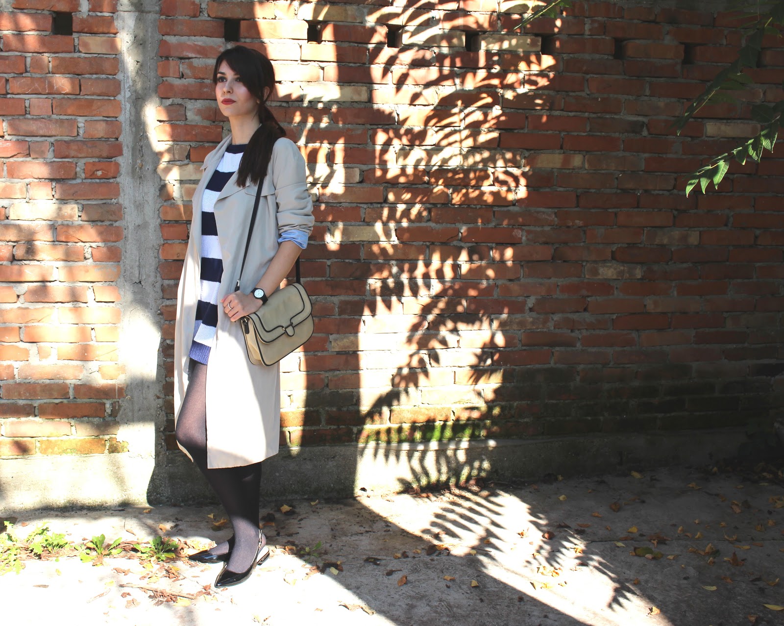 When it comes to trench coats there are two types I really like. First one is the casual, short, cotton trench and the other one is the long, more elegant version. Although the short trench can sometimes look too simple or obvious (we all know the feeling of going out on a rainy day and seeing all the girls wearing this exact coat), the truth is, it's so much easier to wear. You don't have to worry about matching it with the rest of your outfit, because it goes well with almost anything, and it will never get in your way. Long trench, on the other hand, can look weird with some clothes and may touch the floor while you are sitting or if you hang it on a chair so you always have to think about the way you are sitting or where you're hanging your coat. And let's face it, that can be exhausting. Still, I love the way the long trench looks. It's so elegant and chic and you can do wonderful things with it. I like to channel a dose of Parisian vibe (or at least what seems to me like a Parisian vibe) with striped clothes and comfortable flats. You can also wear it with sneakers in the spirit of the new sportswear trend or with high waisted pants and knee high boots. Like I always say, I don't like fashion rules, but try to avoid wearing it with jeans that are too baggy or you may end up with a weird looking silhouette. Also, too many layers under the long trench is not a good idea, if the coat loses its shape the whole outfit looks unbalanced. At the end, it's all about trying it out. Try the outfit first to see what goes well with your trench coat and what doesn't.
